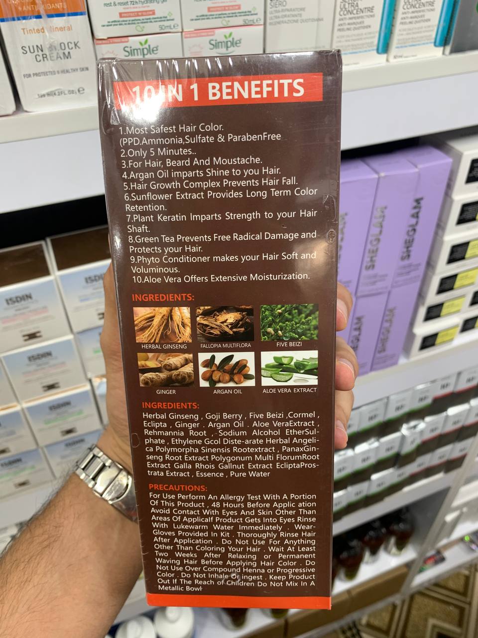 ویژگیها: 1. پوششدهی 100% موهای سفید: موهای خاکستری و سفید را به طور کامل میپوشاند. 2. اثرگذاری سریع: فقط در مدت ۸ دقیقه رنگ مو تثبیت میشود. 3. فاقد اثر روی پوست: باعث تیرگی یا لکه روی پوست نمیشود 4. حاوی روغن آرگان: برای تقویت، نرمی و درخشندگی مو. 5. طبیعی و ملایم: فرمولاسیون گیاهی و بدون آسیب به مو. 6. دوام طولانی: رنگ مو ماندگاری بالایی دارد. 7. استفاده آسان: همانند شامپو استفاده میشود 8. دستکش رایگان: همراه محصول دستکش رایگان ارائه میشود.
