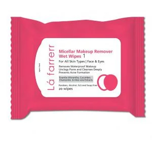 دستمال مرطوب آرایش پاک کن لافارر مخصوص انواع پوست با مبنای پاک کنندگی همچون میسلار واترها، مناسب برای پاک کردن آرایش چشم و صورت فرموله شده که حاوی عصاره‌های گیاهی انانتیاکلرانتا، خیار، بابونه و آلوئه ورا می¬باشد. این محصول علاوه بر برطرف نمودن کامل آرایش، با توجه به ترکیبات مؤثری که در آن به کار رفته، تعادل در چربی و رطوبت پوست برقرار کرده و با رفع انسداد از منافذ مسدود شده از تشکیل آکنه پیشگیری می‌کند. دستمال مرطوب آرایش پاک کن لافارر فاقد پارابن، اتانول، SLS و مواد صابونی می‌باشد تا هیچ گونه حساسیتی از جانب این مواد به پوست تحمیل نشود. مزایای این محصول به شرح ذیل است: پاک کردن مؤثر آرایش‌های ضد آب تنظیم ترشح چربی با عصاره‌های گیاهی رفع و جلوگیری از بروز آکنه باز نمودن منافذ مسدود شده و تمیز کردن عمقی پوست خنثی کردن رادیکال‌های آزاد و کمک به بازسازی پوست