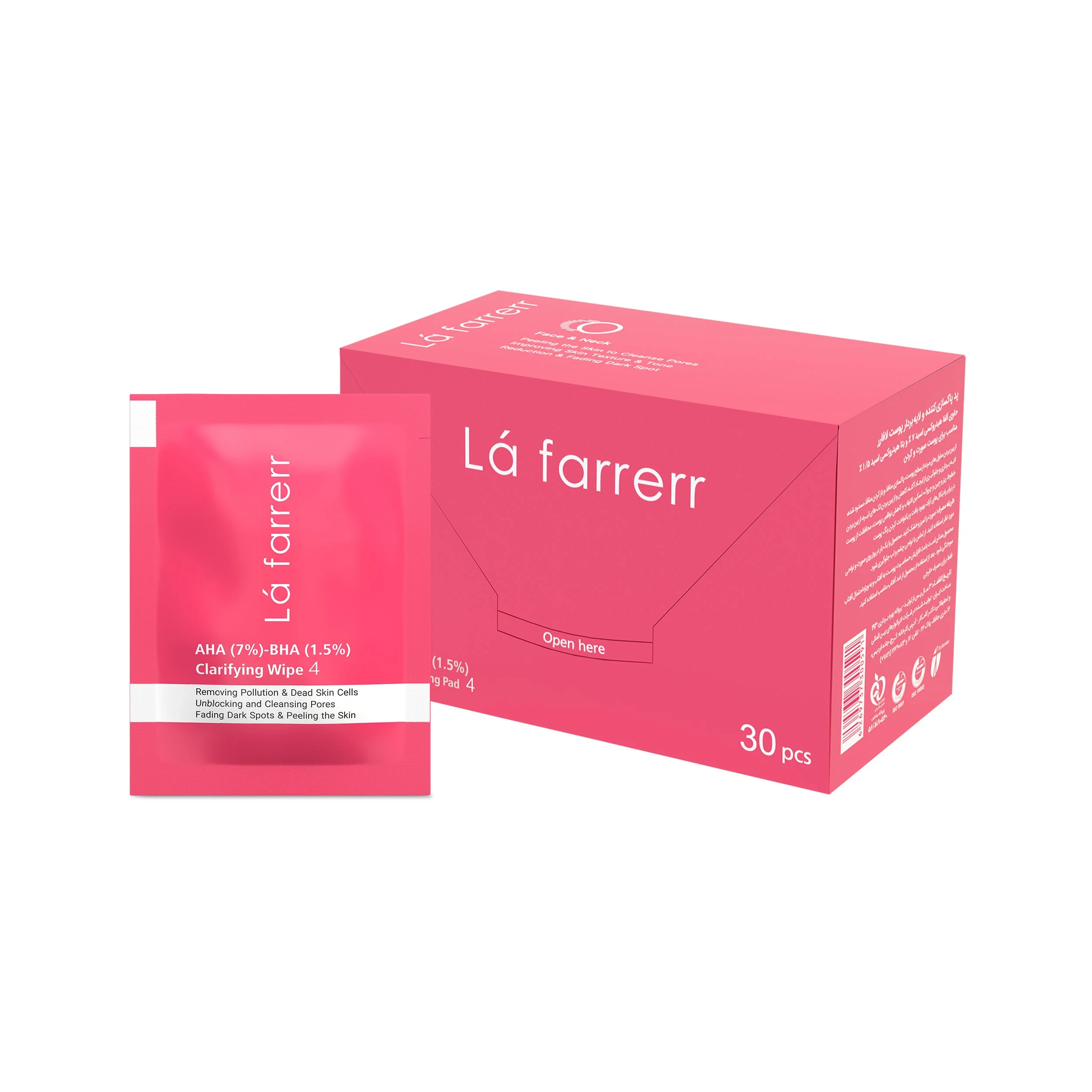 پد پاکسازی کننده و لایه بردار پوست شماره 4 لافارر حاوی آلفا هیدروکسی اسید 7% - 10% و بتا هیدروکسی اسید 1.5% - 2% و همچنین مناسب برای پوست صورت و گردن است. از ویژگی های این پدها می توان به موارد زیر اشاره کرد: لایه برداری و از بین بردن سلول های مرده پوست پاکسازی و رفع انسداد منافذ پوست بازسازی و احیای بافت پوست کاهش لک و یکنواخت کننده رنگ پوست کاهش خطوط ریز و چین و چروک محافظت از پوست در برابر رادیکال های آزاد آلفا هیدروکسی اسیدها (AHA) با لایه برداری سطحی ظاهر پوست را روشن‌تر و یکنواخت‌تر می‌کنند. بتا هیدروکسی اسید (BHA) علاوه ‌بر لایه‌برداری سطحی پوست، به عمق منافذ وارد شده و عمل پاکسازی را انجام می‌دهد. پدهای AHA / BHA لایه‌برداری عمیق تر را برای کمک به مبارزه با لک‌های قابل مشاهده و بهبود درخشندگی پوست ارائه می‌دهند. افرادی که پوست حساس دارند، بهتر است که از پدهایی با درصد کمتر مواد مؤثره استفاده کنند. این محصول حاوی گلایکولیک اسید، لاکتیک اسید، سالیسیلیک اسید، عصاره‌های گیاهی میوه تاسمانی و هاماملیس، بابونه و بید سفید است این محصولات دارای شماره پروانه بهداشتی ساخت:ظ/56/10540 و ظ/56/10538 می باشند