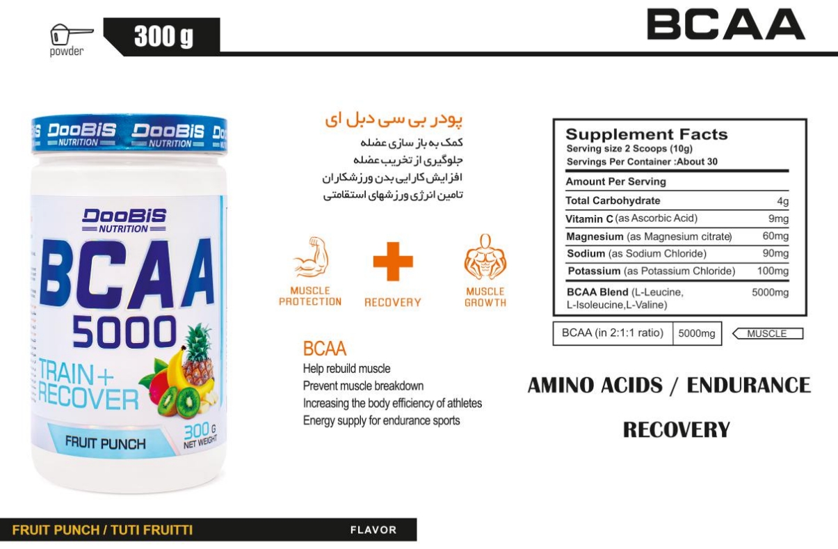 پودر بی سی دبل ای ۵۰۰۰ برند دوبیس حاوی ۱۵ درصد ویتامین سی در هر سروینگ جهت پیشگیری از تخریب و تحلیل عضلات و تامین انرژی در ورزشهای استقامتی می باشد.